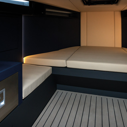 Treten Sie ein in eine Kabine, die keine Wünsche offen und Sie vergessen lässt, dass Sie sich auf einem Boot mit begrenzten Platzverhältnissen befinden. Jeder einzelne Quadratzentimeter im Innern ist optimal genutzt. Der Raum überrascht durch seine Grosszügigkeit und Funktionalität, die Sie sonst nur in viel grösseren Interieurs finden. Edle, aufeinander abgestimmte Materialien, ein harmonisches Lichtkonzept und eine durchdachte Raumaufteilung sorgen dafür, dass Sie sich in der vollausgestatteten Kabine jederzeit wohl und behütet fühlen.